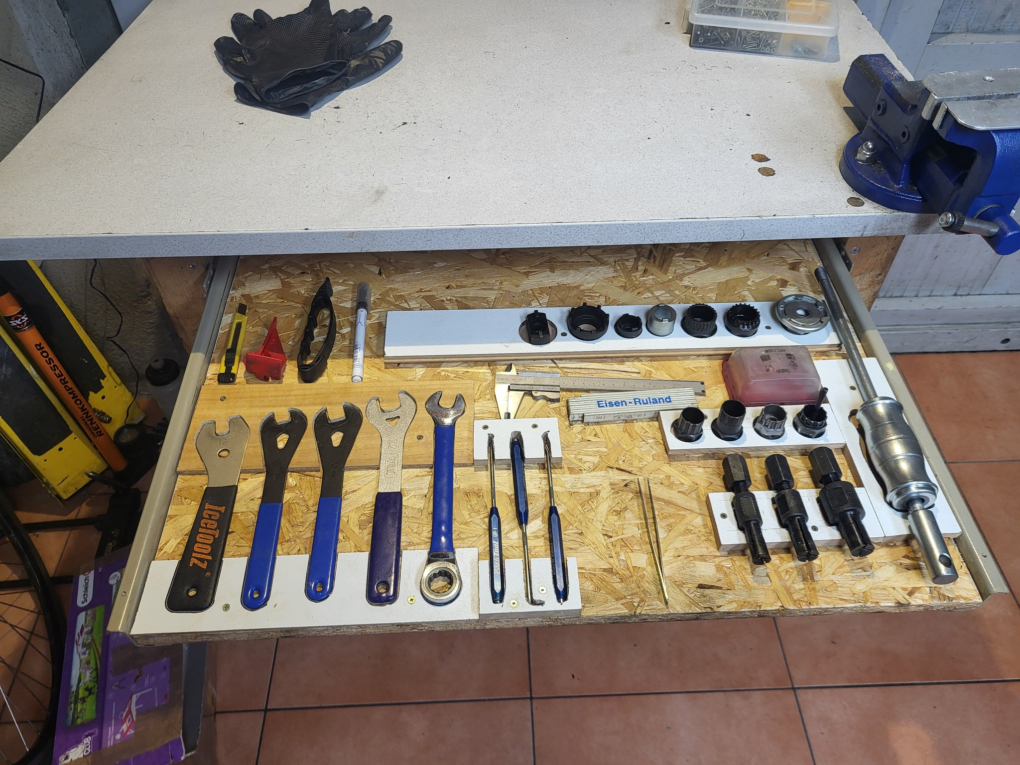 Daher wollte ich nicht jedesmal, wenn ich eine Nabe warte zur Werkzeugwand um mir den Konusschlüssel zu holen.